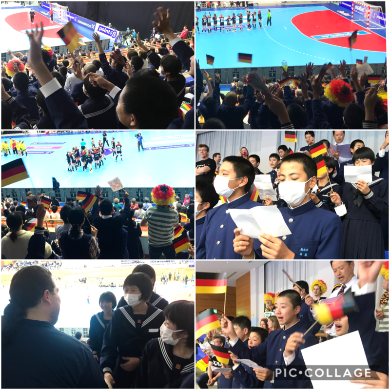 試合は、ドイツが34対8と圧勝。試合後、鹿北中生が歌う国歌、さらに、ドイツの旗を振ると、コートからドイツ選手の皆さんが手を振ってくださいました。今日の試合、鹿北中生はドイツチームの最高のサポーターとなったことを実感しました。