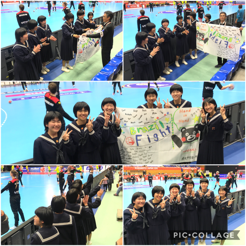 試合は白熱した展開となり、ランキングでは上位のフランスに対してブラジルが善戦し、鹿北中生の応援にも熱が入ります。そして、何と19対19の同点でタイムアップ。ブラジルは勝ったかのように大喜び。鹿北中応援席も同じように大喜びしました。