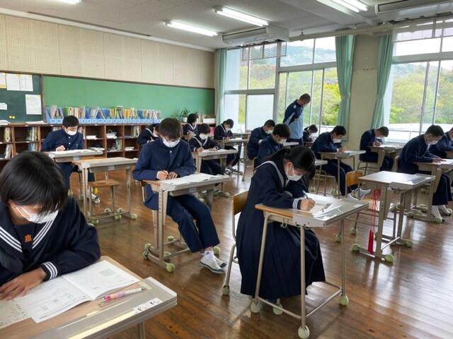 4月12日(火)、1~3校時は学力検査(国語、理科、英語)でした。どの学年も、どの生徒も、真剣に問題に向き合っていました。1年→2年→3年と順に見て回ったのですが、3年生のテストを受ける様子には風格のようなものを感じました。