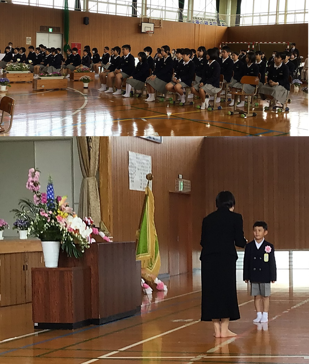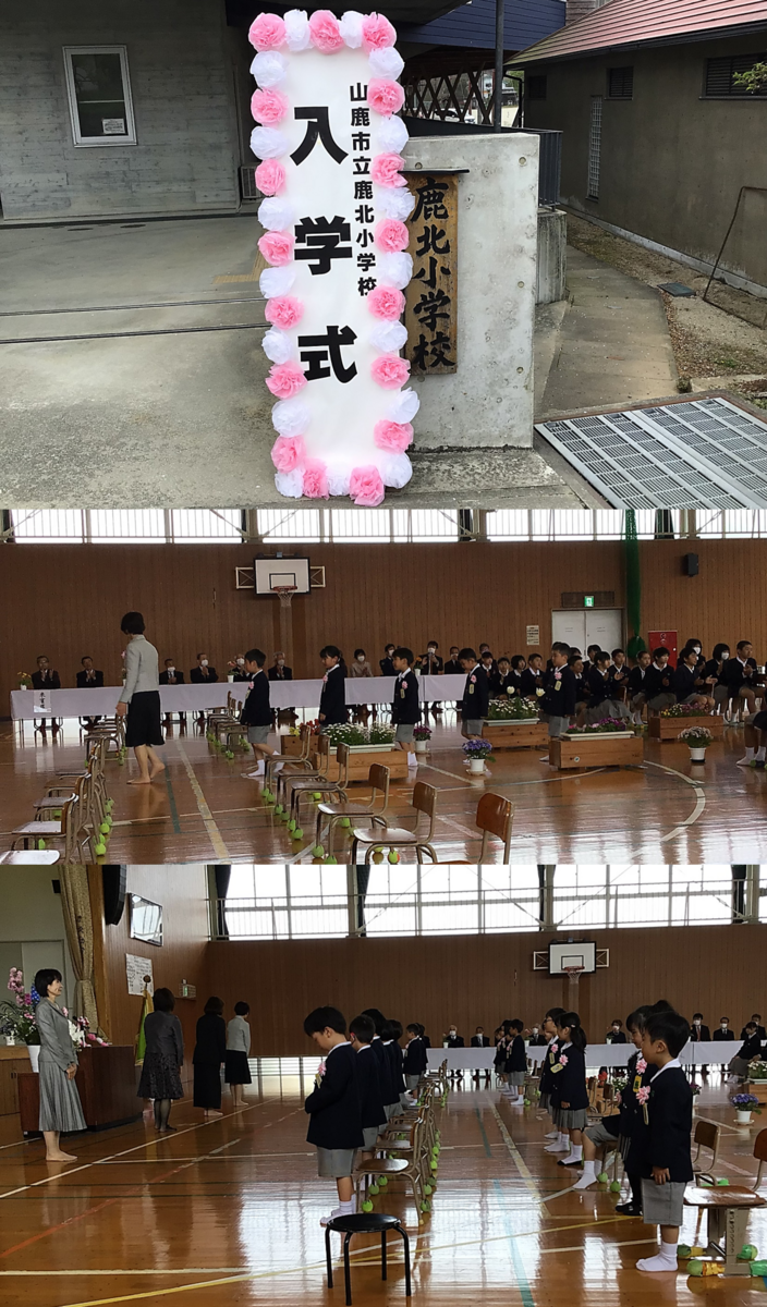 4月11日(火)の午前中。鹿北小学校の入学式に出席させていただきました。新入生のみなさん、保護者の皆様、ご入学おめでとうございます。鹿北小・中学校は、小中一貫教育を行っていますので、職員席に座らせていただきました。新6年生と5年生が飾りつけてくれた会場で、来賓の皆様にも花を添えていただき、21名の1年生を迎える温かい雰囲気の式でした。校長先生の式辞に返事をしながら聞く新入生の姿に、思わずほおが緩んでしまいました。6年間での成長が楽しみです。さあ、午後は中学校の入学式です!