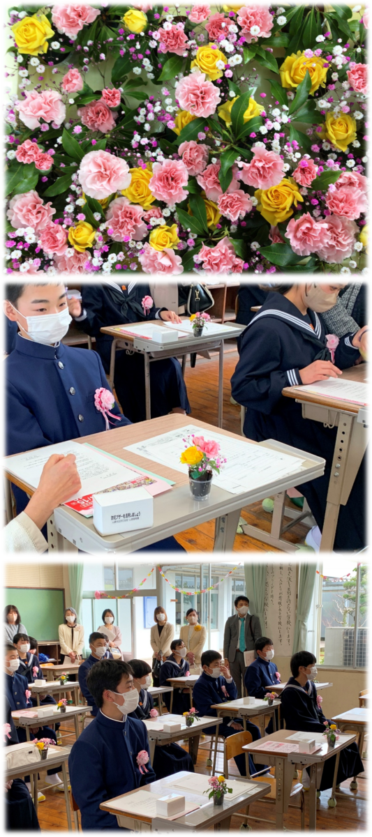 4月10日(月)の夕方。昨年度まで本校にいらっしゃった木庭先生が可愛いお花を持ってきてくださいました。所属されている“さくら会”からのプレゼントで、「新入生へのお祝いに」とのことでした。早速1年生教室に持って行き、生徒の机に1つずつ飾らせていただきました。写真は11日の入学式後の学活の様子ですが、このお花のおかげで彩が加わりとても華やかになりました。さくら会の皆様、ありがとうございました。