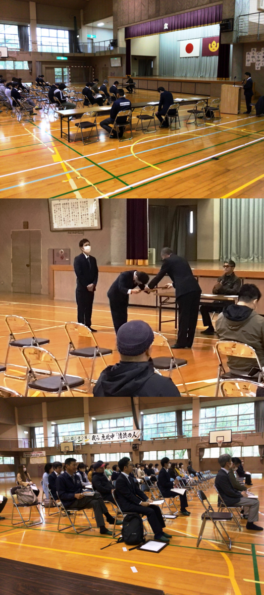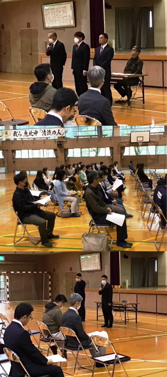 4月15日(土)の3校時にPTA総会を行いました。今年度は、保護者の負担軽減になればと、鹿北小と鹿北中が同日に授業参観とPTA総会を実施してみました。午前中に中学校が、午後に小学校です。そのため、総会の予定時間も60分。この時間で、PTA総会、部活動総会、歓送迎会を行いました。新旧役員さんの綿密な計画と打ち合わせ、議長さんの的確でスピード感ある進行、会員みなさんの温かいご協力で、ぴったり60分で終了しました。驚くとともに鹿北中保護者のすごさを今回も思い知らされました。保護者の皆様、1年間のご協力、よろしくお願いいたします。