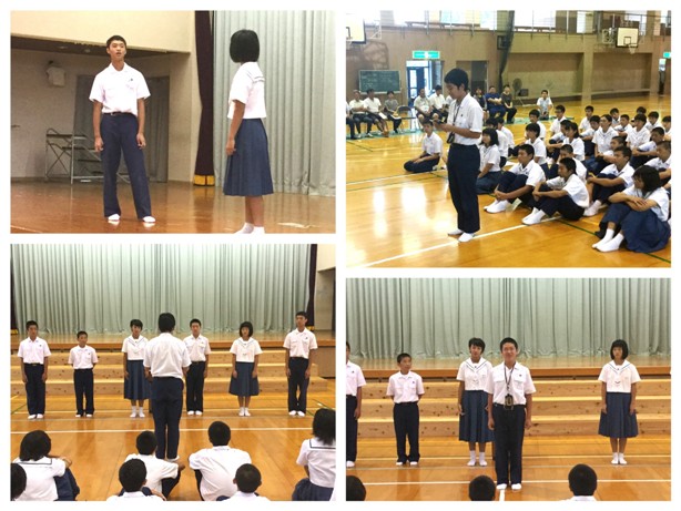 9月14日(木)8時10分より全校集会を行いました。今回は山鹿市中体連陸上競技大会の報告会と英語暗唱大会代表生徒の推戴式を行いました。