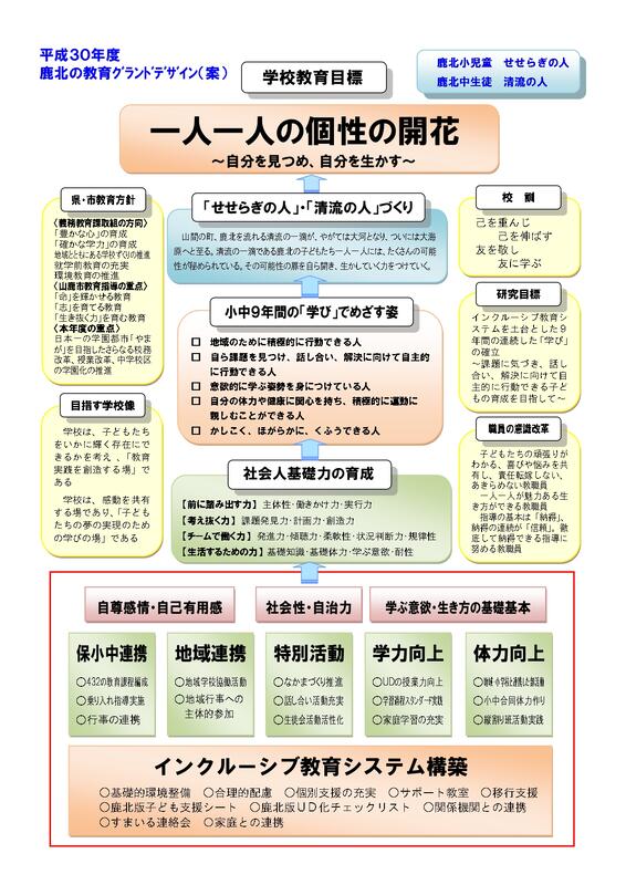 今まで研究を重ねてきたことを継続して取り組んでいきたいと考えている。特に、インクルーシブ教育システムを土台とした、学力向上、体力向上に取り組んで行く。学力向上では、鹿北版学習過程スタンダードのスキルアップにより、主体的・対話的で深い学びの実現、個別支援の充実や個に応じた効果的な家庭学習の確立を図っていきたい。インクルーシブ教育システムを土台とすることで、誰もが授業に参加でき、一人一人が認め合える支持的風土づくりにも力を入れていきたい。