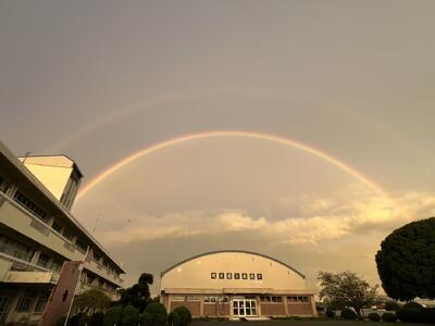 9月5日   昨日の夕方、東の空に大きな虹がかかっていました。とてもきれいで、大きく、しかも二重の虹でした。久しぶりにこんな虹を見ました。あまりにも美しかったので思わず足を止めて見入ってしまいました。子ども達みんな見ることができたかな? ・・・いいことあるかな!?