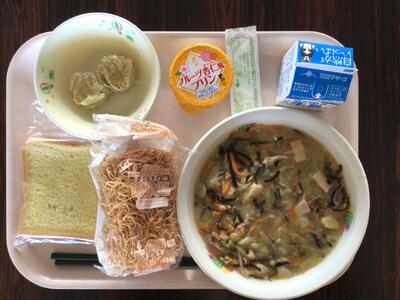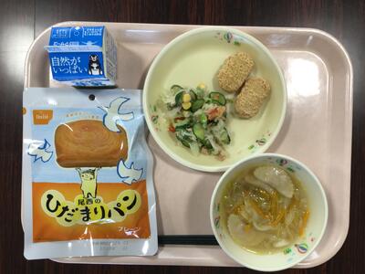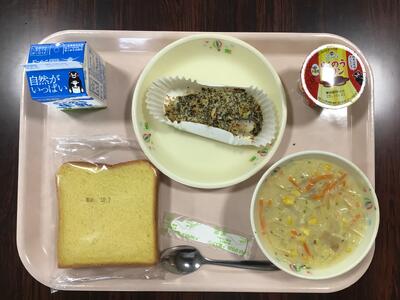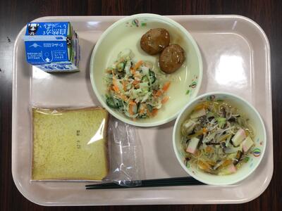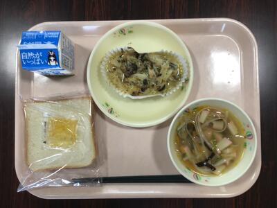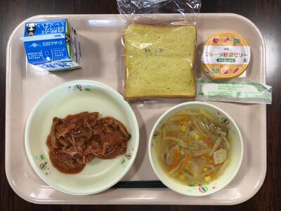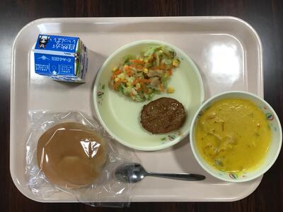 今日は、黒糖パン、じゃがいものスープ、ハンバーグのきのこソース、牛乳でした。