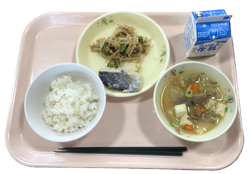 今日の献立:麦ごはん 牛乳 豚汁 さわらの塩麹焼き ごまあえ