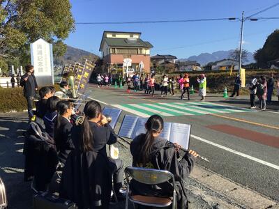 12月1日 昨日11月30日、第1回山鹿灯籠ウィメンズマラソンが「社会に貢献されている多くの女性に対して地域としての感謝と敬意を表し、走者をおもてなしする大会」という大会趣旨のもと開催されました。当日は天候にも恵まれおよそ800人を超える参加者があったそうです。鹿本中では吹奏楽部が鹿本商工高校軽音部と一緒に演奏で応援し、大会を盛り上げました。多くのランナーの皆さんは手を振ってくださり、感謝のジェスチャーもありました。おかげで応援する側も楽しく参加することができました。音楽の持つ力のすごさも感じることができました。