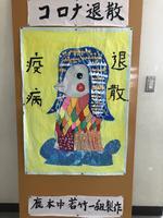〇新型コロナウイルス感染症の終息を願って、学校事務室前に肥後国(熊本県)の妖怪「アマビエ」が飾られました。若竹1組の生徒たちが作成しました。来校された際には是非ご覧ください。(6/5)