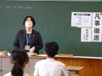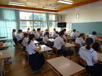 2年生は11月の職場体験学習を前に、(株)東京リーガルマインドの 草野 幸栄子 様を講師にお迎えし、①様々な仕事に興味を持ち調べることができる。②自分の将来について自ら考える事ができるようになる。③マナーを身につける大切さを知り意識して実践することができる。を目的に職業ガイダンスを実施しました。日頃から話題になるあいさつについては、「【あ】あかるく【い】いつでも【さ】さきに【つ】つなげるという意識が大切」など具体的にお話をしていただきました。将来にわたって必要なスキルや就職へ向けた心構え等を学ぶ貴重な機会となりました。