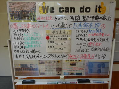2学期がスタートし1週間が終わろうとしています。生活リズムを立て直すのに少し苦労した生徒もいたかも知れません。今週はチャレンジマッチ、教育委員会の学校訪問等ありました。学級では10月の合唱コンクールに向けた目標づくりも行われていました。来週は9日から11日まで「前期期末テスト」となります。しっかり復習してテストに臨んでほしいと思います。