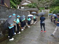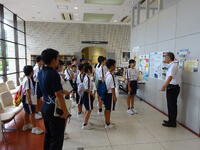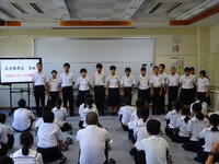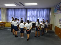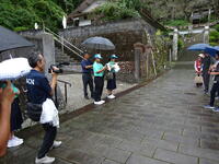 ボランティアガイドで1年生9人がデビューを果たしました。天草市観光振興課や天草宝島案内人の会の皆様に見守られながら「大きな声でゆっくり」と堂々としたガイドを披露してくれました。7月に5日間の養成講座、9月には現地で先輩である3年生ガイドの見学等を経てこの日を迎えました。エメラルドグリーンのポロシャツが輝いて見えました。今後、さらにレベルアップすることを期待しています。