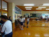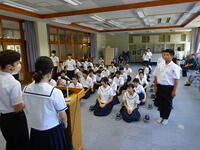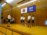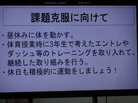 朝から生徒朝会を行いました。初めに男子ソフトテニス部の表彰。続いて代議委員会からチャレンジテストの結果報告と満点賞の表彰、生活委員会からは体力テストの結果から見えた課題や今後の対応策について提案がありました。「握力」や「反復横跳び」は県基準値を上回る学年が多かったです。一方で「50m走」、「持久走(男子1500m、女子1000m)」では課題が残る結果となりました。今後、体育の授業を中心にトレーニングに取り組んでいく予定です。休日等も自分で運動する機会を設けて欲しいと思います。