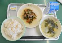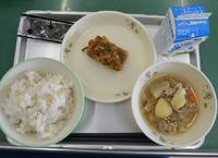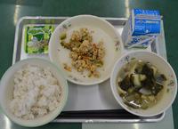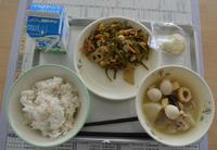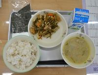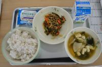 本日の献立は、麦ご飯、呉汁、ごぼうの金平、ひじきのり佃煮、牛乳でした。今日は学校評議員の方も一緒に給食を食べられました。「美味しかった」と言われていました。