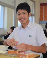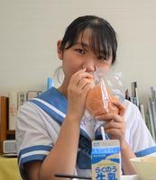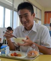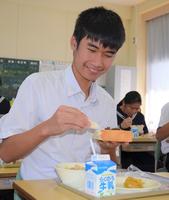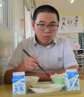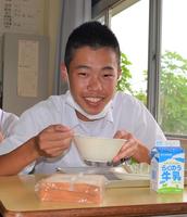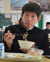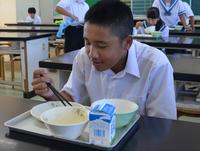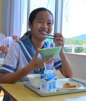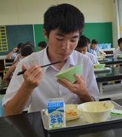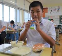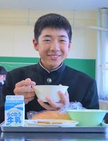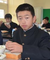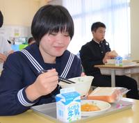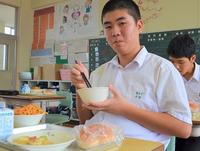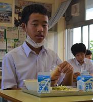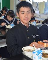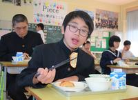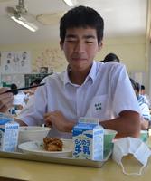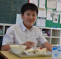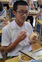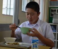 本日の献立は、米粉パン、牛乳、なすとベーコンのスパゲティ、フルーツミックスです。1年生のある男子に今日の給食について聞いてみたところ、「全部美味しかったです」とのことでした。写真は昨日に続き、3年生です。