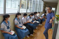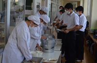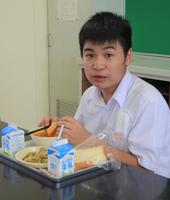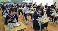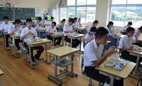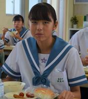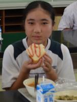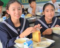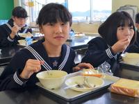 本日の献立は、食パン、牛乳、かぼちゃのクリーム煮、海藻サラダ、ソフトチーズでした。今日は1年生の教室を訪問しました。人数が多いので専用のランチルームがあります。また、給食準備の係でない生徒は、準備が終了するまで静かに読書をして待ちます。