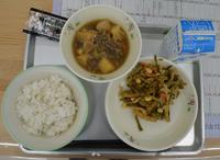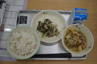 本日の献立は、麦ご飯、牛乳、筑前煮、しめじとほうれん草の炒め物、ひじきののり佃煮でした。筑前煮には、たけのこがたくさん入っていました。孟宗竹のたけここで、熊本県産とのことです。