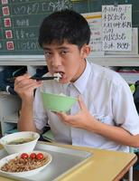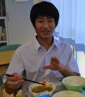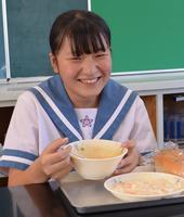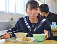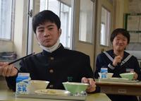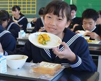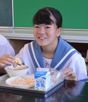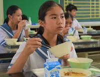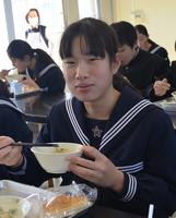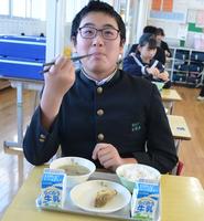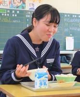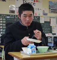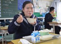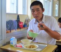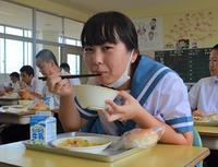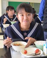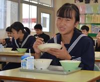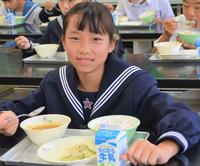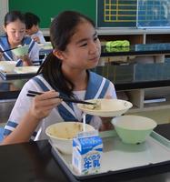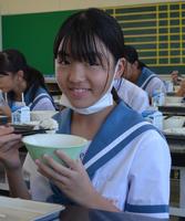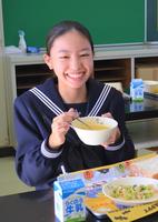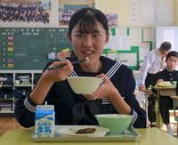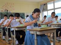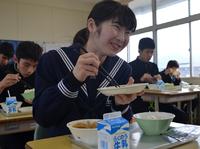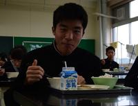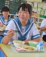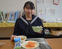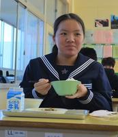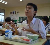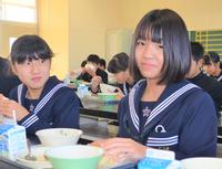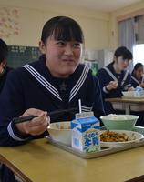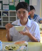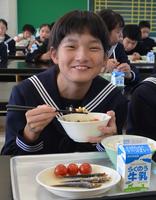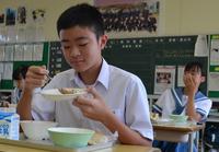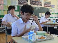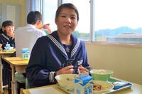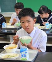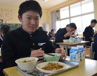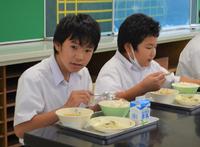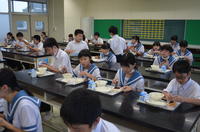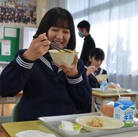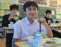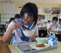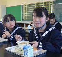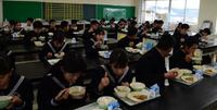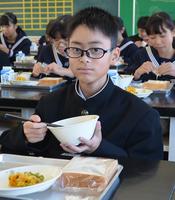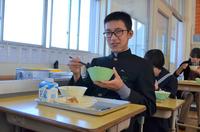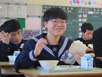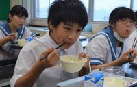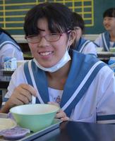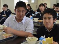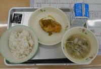 本日の献立は、麦ご飯、牛乳、もずくスープ、魚のカレー南蛮、味付けのりでした。本日は一年生を訪問しました。やっと中学校の給食の量にも慣れ、みんなしっかり食べています。大好きなメニューをおかわりするにはジャンケンに勝利する必要があります。さて、今日は誰が勝ったのでしょうか?