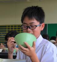 本日の献立は、麦ご飯、牛乳、呉汁、魚の甘酢あんかけでした。呉汁は煮干しでだしをとってあります。日本では、昔からだしをとる習慣があります。煮干し以外にも、こんぶや鰹節、干し椎茸が使われていました。