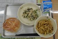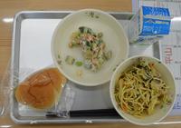 師走(12月)は、急に気温が下がり、風邪が心配されます。そこで、給食は風邪予防に効果のある、冬が旬の野菜やきのこ、くだものを十分とれるように献立が考えてあります。本日の献立は、テーブルロール、牛乳、ほうれん草スパゲティ、ビーンズサラダでした。冬野菜のほうれん草は、皮膚の粘膜を病気から守るカロテンが豊富な野菜です。