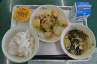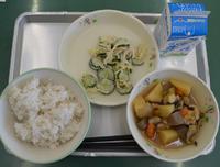 本日の献立は、麦ご飯、牛乳、のっぺ汁、きびなごカリカリフライ、青リンゴゼリーでした。これからリンゴが旬を迎えるということで、青リンゴゼリーが出たそうです。きびなごもなかなかお家では食べる機会が少ないと思うので、給食で出るとうれしいです。