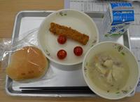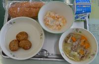 本日の献立は、背割りコッペパン、牛乳、野菜のスープ煮、つくね照り焼きソース、フルーツクリームでした。「フルーツクリームはコッペパンにはさんで食べるとおいしいですよ」という放送が流れましたが、準備がはやく、食べるのもはやい2年生は、すでにパンを食べ終わっている人もいて、はさんで食べるのは次回に持ち越しです。