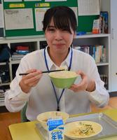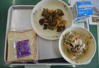 本日の献立は、食パン、豆腐だご汁、春雨と挽肉の炒め物、ソフトチーズ、牛乳でした。