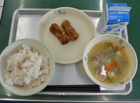 今日の給食は、麦ご飯、鶏ごぼう汁、ちくわの二色揚げ、牛乳でした。