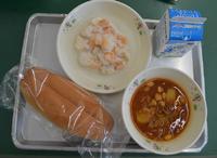 本日の献立は、背割りコッペパン、牛乳、鶏ごぼうスープ、カレーそぼろでした。カレーそぼろをパンの切れ目ににはさんで食べました。
