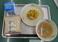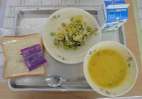本日の献立は、食パン、牛乳、かぼちゃポタージュ、枝豆サラダ、ブルーベリージャムでした。明日がハロウィンということで、メニューにかぼちゃポタージュが入っています。