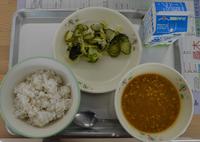 9月最初の給食の献立は、麦ご飯、牛乳、呉汁、ゴーヤチャンプル、アセロラゼリーでした。にがうりは、塩もみして、下ゆでして、苦みをかんじないように調理をするとのこと。給食にでるゴーヤは、子ども達でも食べられるように工夫されています。