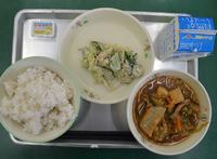 本日の献立は、麦ご飯、牛乳、ビーフカレー、こんにゃくサラダでした。カレーは給食のメニューの中でも、昔も今もとても人気があります。今日も美味しくいただきました。