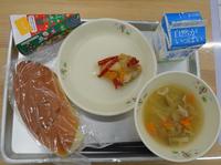 本日の献立は、食パン、牛乳、ビーンズスープ、かぼちゃサラダ、ソフトチーズでした。かぼちゃは固いので、一度ゆでてから切るそうです。固いかぼちゃは身が引き締まり甘いそうです。