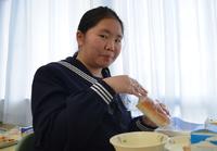 本日「小正月」の献立は、食パン、牛乳、ボルシチ、白菜とりんごのサラダ、コーヒークリームでした。コーヒークリームは手作りで、時間をかけて練り上げて作ります。