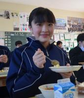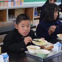 1月24日から30日は「全国学校給食記念週間」です。そこで、今週の献立は、それぞれテーマを掲げた内容のものになっています。今日は、地場産物を使った献立で、麦ご飯、牛乳、こそで団子汁、県産真鯛の照り焼き、白菜昆布あえでした。給食に真鯛がでるのはとても珍しいことですが、今日の真鯛は水産業者さんが無償で提供して下さっているものです。