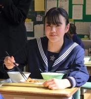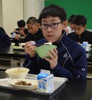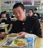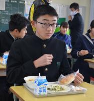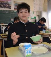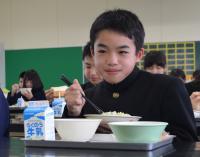 1月24日から30日は「全国学校給食記念週間」です。そこで、今週の献立は、それぞれテーマを掲げた内容のものになっています。今日は、地場産物を使った献立で、麦ご飯、牛乳、こそで団子汁、県産真鯛の照り焼き、白菜昆布あえでした。給食に真鯛がでるのはとても珍しいことですが、今日の真鯛は水産業者さんが無償で提供して下さっているものです。