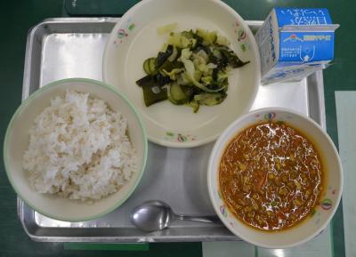 本日の献立は、麦ご飯、キーマカレー、海藻サラダ、牛乳です。とっても美味しかったです。尚、先週の8日(金)の給食中止の影響で、明日の献立がかわります。