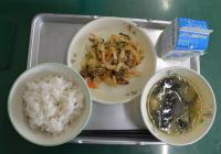 本日の献立は、麦ご飯、牛乳、あおさ汁、ビビンバ具でした。ビビンバ具は、ご飯にのせて、混ぜながら食べます。あおさ汁には春菊が入っていました。春菊はごぼうとおなじ「キク科」の野菜だそうです。また、春菊は、ヨーロッパでは観賞用に育てられるほどきれいな黄色の花が咲くそうです。