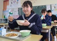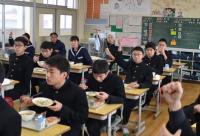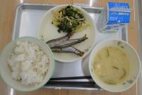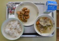 朝の冷え込みがうそのように、昼間は春を感じさせる暖かさです。さて、今日の献立は、麦ご飯、牛乳、呉汁、小いわし梅の香揚げ、れんこんきんぴらでした。今日は3年生の教室を訪問しました。3年生が学校給食を食べるのも、後20回ぐらいです。