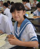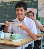 本日は「ふるさとくまさんデー」です。そのため、熊本県の産物を使った献立になります。献立は、麦ご飯、牛乳、トマト入り団子汁、なすのひこずり、手巻のりです。