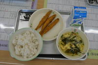 本日の献立は、麦ご飯、かき玉汁、ししゃものフライ、味付けのり、牛乳でした。ししゃもは、一人3匹食べました。