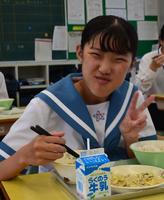 本日の献立は、米粉パン、牛乳、なすとベーコンのスパゲティ、フルーツミックスです。1年生のある男子に今日の給食について聞いてみたところ、「全部美味しかったです」とのことでした。写真は昨日に続き、3年生です。