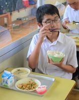 9月最初の給食の献立は、麦ご飯、牛乳、呉汁、ゴーヤチャンプル、アセロラゼリーでした。にがうりは、塩もみして、下ゆでして、苦みをかんじないように調理をするとのこと。給食にでるゴーヤは、子ども達でも食べられるように工夫されています。