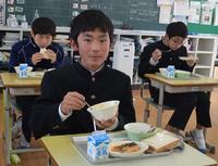 1,2年生も3年生の合格を祈願してトンカツを「ガブリ」と食べました。