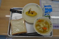 今日の給食は、食パン、オムレツの和風ソース、野菜のスープ、牛乳、黒ごまクリームでした。