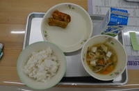 今日の給食は、麦ご飯、鶏ごぼう汁、ちくわの二色揚げ、牛乳でした。