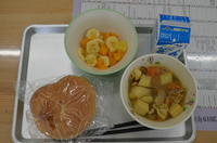 本日の献立は、ひのくにパン、カレー肉じゃが、フルーツミックス、牛乳でした。