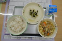 本日の献立は、麦ご飯、五目煮、野菜ソテー、牛乳でした。