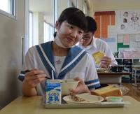 本日の献立は、食パン、牛乳、かぼちゃのクリーム煮、海藻サラダ、ソフトチーズでした。今日は1年生の教室を訪問しました。人数が多いので専用のランチルームがあります。また、給食準備の係でない生徒は、準備が終了するまで静かに読書をして待ちます。