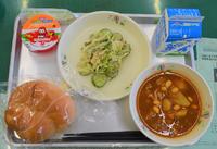 本日の献立は、ひのくにパン、牛乳、チリコンカン、ゴーヤサラダ、アセロラゼリーでした。ゴーヤサラダはゴーヤの苦みがとれてとても食べやすくなっていました。
